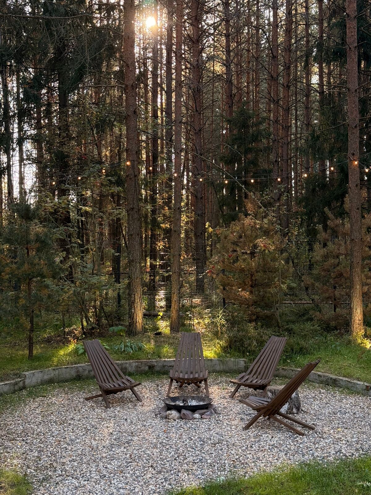 Лаунж-зона с костровой чашей и шезлонгами просто рай для уютных посиделок.